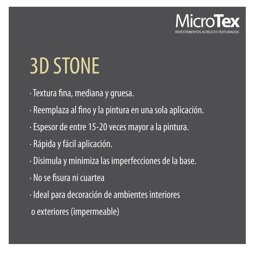 MICROTEX 3D STONE es un revestimiento a base de resinas acrílicas y cargas minerales naturales. Es impermeable, resistente, flexible y permite lograr un muy buen efecto decorativo.